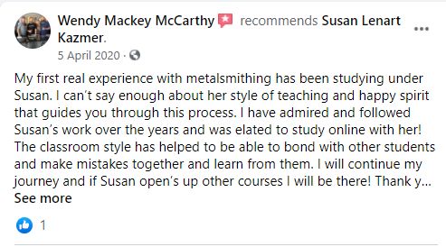 I have LOVED being a part of the Intentional Metalsmithing Movement! I feel very blessed to have been able to take these courses. The classes are PACKED with wonderful techniques and examples. One of the great things about an online course is having the ability to watch sections over and over and finding new material you might have overlooked. These classes are for ALL levels of metalsmithing. I believe that my eyes have been opened to new and exciting directions in metalsmithing. Susan taught me that there are no mistakes, just new possibilities.